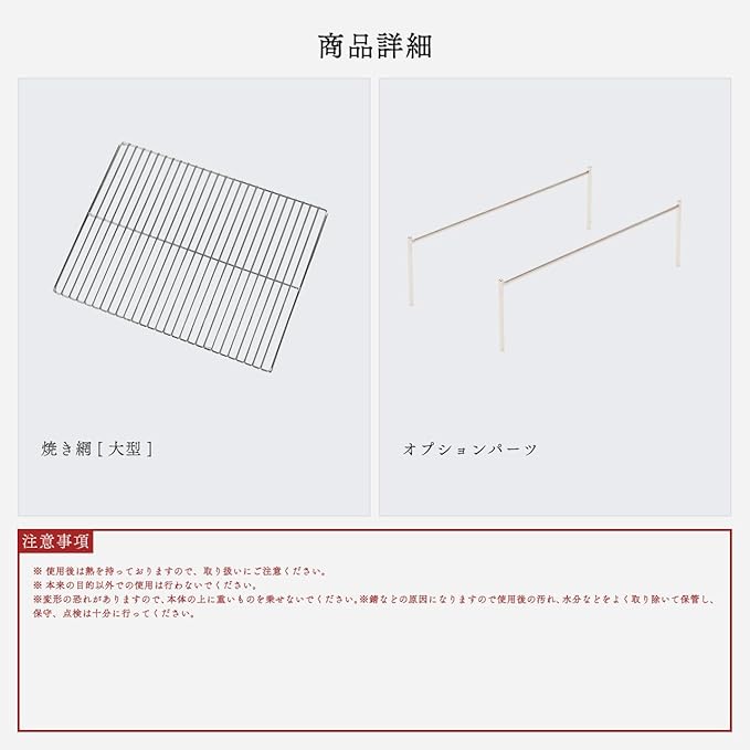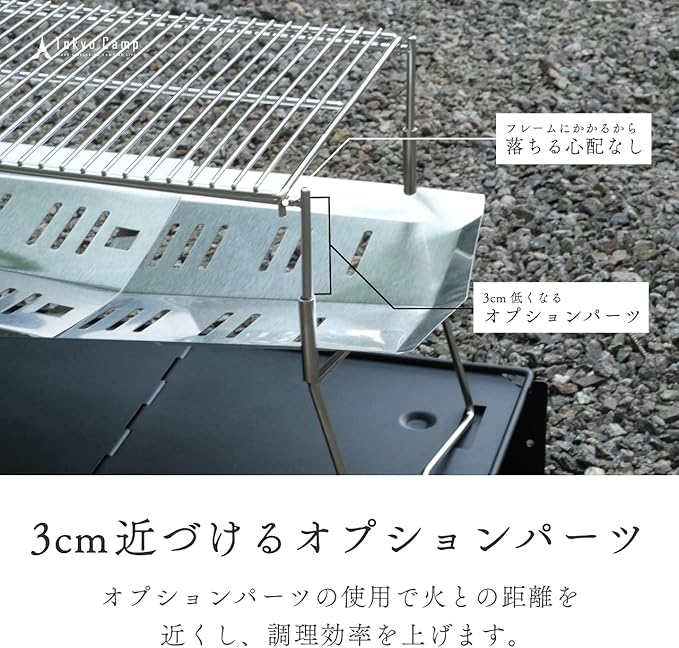 【 大型網 +OPセット 】 Tokyo Camp 焚き火台 専用の 大型 焼き網 と オプションパーツ のセットになります。 TokyoCamp 焚き火台 と併用していただくことで、より幅広い 焚火 飯料理やバーベキュー、焼き肉といった所までお楽しみいただけるようになります。 焼き網 は 焚火台 のフレームに引っ掛かるように設計されており、だれでも簡単に設置することができます。
