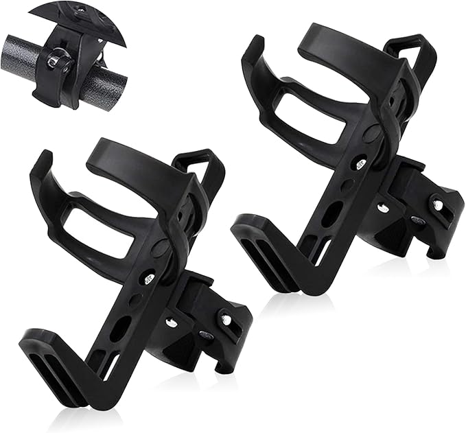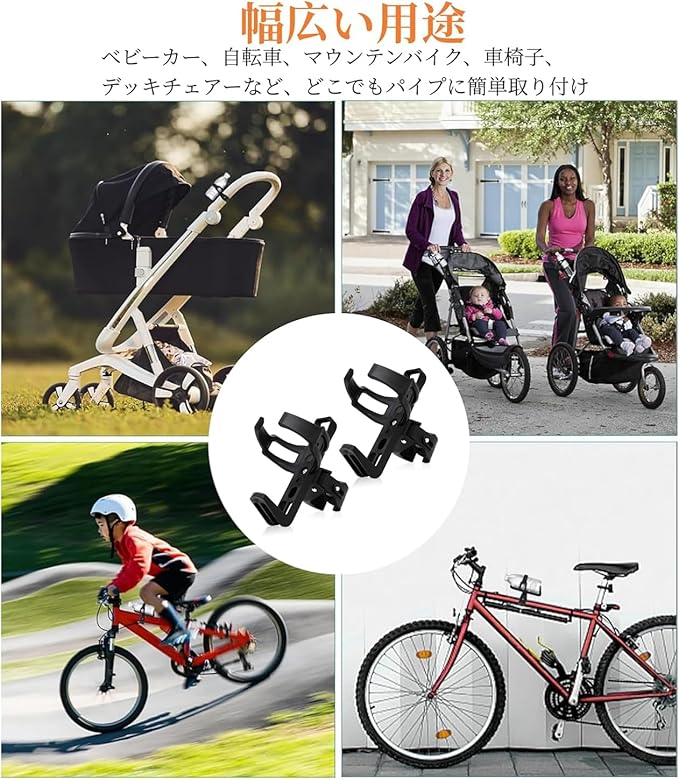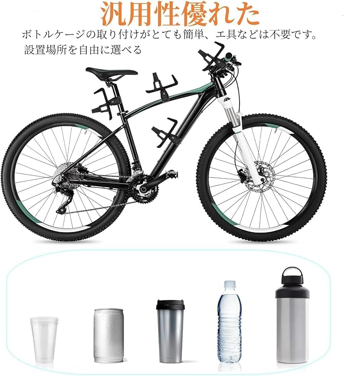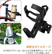 【商品情報】 商品名:自転車ドリンクホルダー セット内容:自転車ボトルケージx2 重さ:約200g サイズ:約14.5 14.5cm 対応ボトルサイズ:直径約6.35-8.4cm ブラケット開口:直径約1.5-4.3cm 材質:PC カラー:ブラック 【耐久性抜群】 高弾性PC素材。軽量で十分な強度があり、使い心地が良く、耐久性と軽さを兼ね備えます! 【360度回転設計】 ボトルケージは自転車や乳母車バギーなどの車のタイプに合わせて、360度回転可能の設計により、任意の角度に調整できます。 クランプの調整スイッチを回すことで直径を調整・固定します。 【安全設計】 クランプの調整スイッチを回すことにより、取り付け径の調整ができます。クリップ式で自転車を傷つけません。お子さまがはずしにくいベビーカー専用、安全設計のカップホルダーです。 【高汎用性】 ほとんどのウォーターボトルに対応できるため、さまざまな形状のウォーターボトルを安全に持ち運ぶことができます。自転車のハンドルバーに簡単に取り付けるボトルホルダーです。それに自転車にどこでもクランプでしっかり固定できるドリンクホルダーです。