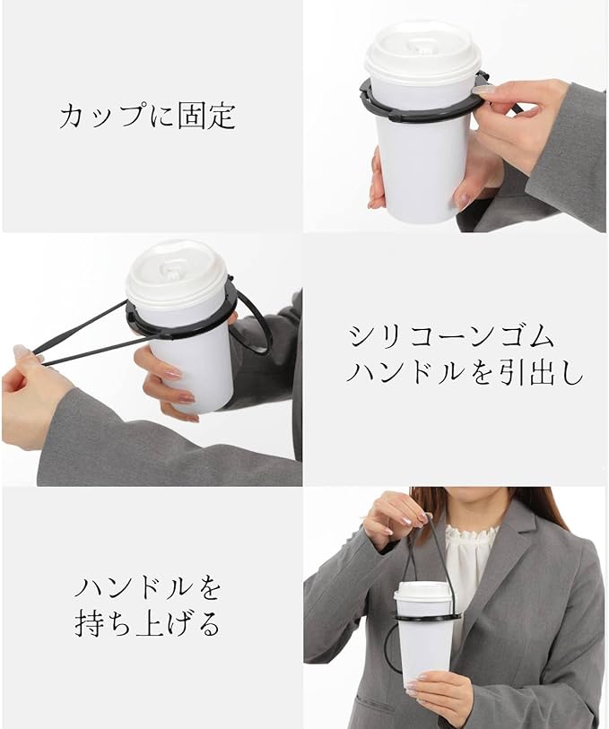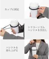 【持ち運びを楽にする】ドリンクカップを手提げ感覚で持ち運べます。ドリンクカップが手を占有してしまうことから解放されます。またカップが熱い、冷たいを気にせず持ち歩けます。