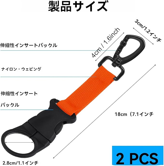 【商品名】ペットボトルホルダー 2 個セット(キーリング付きカラビナ)【商品仕様】・セット内容:2 個入り・カラーバリエーション:ブラック、アーミーグリーン、カーキ、レッド、ブルー、イエロー、ピンク、オレンジ・サイズ:約 18cm 2.8cm・材質:ABS 樹脂+ナイロン+アルミニウム合金【主な特徴】① 三重固定システム:マジックテープ、360 度回転バックル、強力ペットボトル カラビナ ホルダー構造で、様々なシーンでしっかり固定。カラビナ部分はペットボトルホルダー カラビナ仕様で、取り付けや外しも簡単です。② ベルト差し込み式デザイン:手を解放し、アウトドア活動に最適。ペットボトルリングのような軽量化デザインで、装着感を軽減します。③ 瞬時取り外し構造:ボトルのキャップ部分だけをホルダーから外せば、すぐに飲める。ペットボトルホルダー特有のスムーズな取り外し機能を備えています。④ 追加機能:キーリング付きのペットボトル カラビナを搭載し、シリコン材質により、滑りにくく、振動を和らげます。【おすすめシーン】キャンプ、登山などのアウトドアシーンに最適。いつでもどこでも水分補給ができ、ペットボトルホルダーならではの快適性と機能性で、軽装でアクティブなアウトドアライフをお楽しみいただけます!