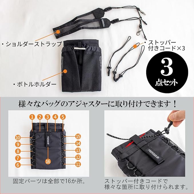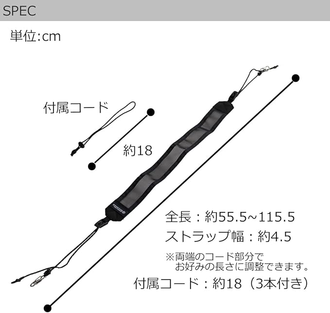 【サイズ】本体:約W15 H19~28 D2.5cm、ストラップ:長さ約55.5~115.5 W4.5cm、コード:長さ約18cm 3 【重量】約110g 【素材】ナイロン、アルミニウム 【生産国】台湾