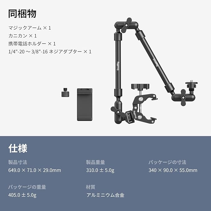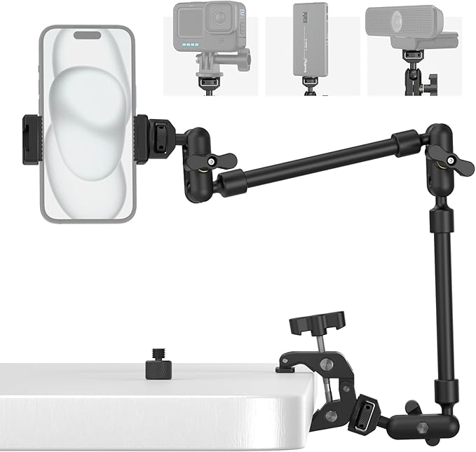 【複数のデバイスに対応】標準の1/4"-20ネジ2本、1/4インチ-20から3/8"-16アダプター、幅7〜10cmの携帯電話と互換性のある電話クランプ、iPhone用、Samsung用、一部のマイクと互換性があり、ウェブカメラ、ライト、アクションカメラなどに適しています。