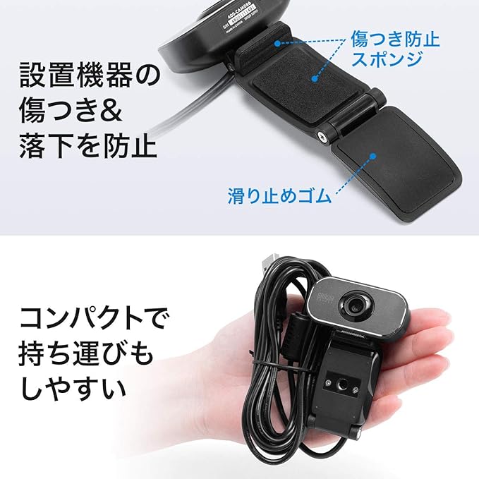 ノートパソコンやデスクトップPCのディスプレイに取付可能なスタンド付きです。また、カメラ底面にカメラ用三脚ネジ(UNC1/4インチネジ)を内蔵で、市販のカメラ三脚に取り付けできます。(※カメラ三脚は別売)