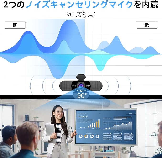 【2つのノイズキャンセリングマイクを内蔵】EMEET 1080pウェブカメラは2つのノイズキャンセリングマイクを内蔵し、騒がしい環境の中でも拾った必要な音をクリアに向こうへ送ることができます。さらに、ノイズキャンセリング機能は周囲のノイズを低減し、ビデオの音質を向上させるため、クリアな音声と臨場感あふれる会議体験をお楽しみいただけます。