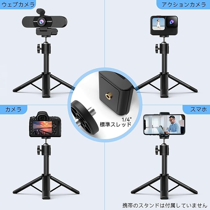 【3段階の高さ調節】ウェブカメラの三脚の高さは3段階(14.5-31.0cm)に調節可能です。14.5cmに調整すると、自分の顔が相手にはっきりと見えるので、テレビ会議での使用に適しています。22.5cmに調整すると、上半身が見えるようになり、グループプレゼンやPPTの説明をするのに適しています。31.0cmに調整すると、全身を写すことができます。また、三脚には滑り止めがついており、カメラが滑る心配もありません。