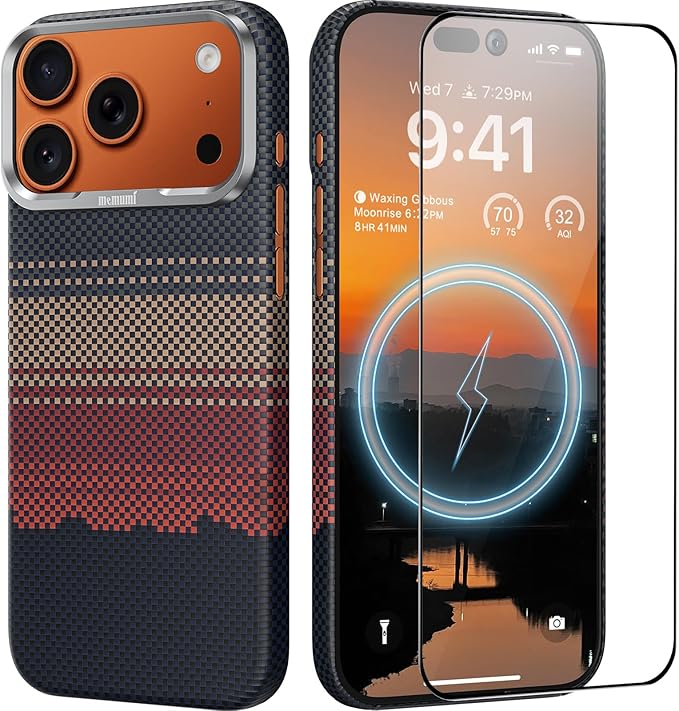 「memumi」マグネット搭載アラミド繊維ケース iPhone 17 Pro Max用の耐衝撃保護カバー1500Dアラミド繊維浮き織り[強化ガラスフィルム付き] ワイヤレス充電対応 ミニマリスト シンプル