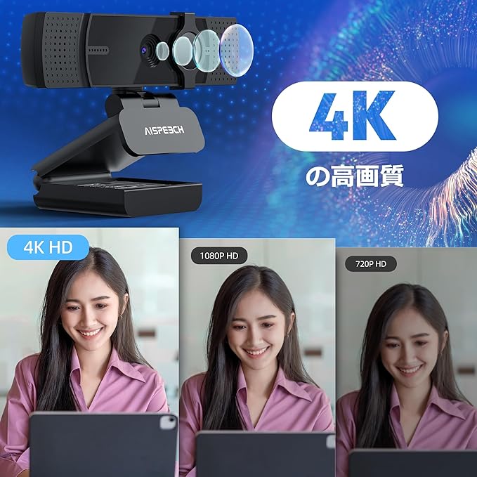 驚きの4K超高精細映像 - AISPEECH 4K ウェブカメラは、1200万画素センサーを搭載し、息をのむほど鮮明な映像を実現。4K/30FPS、1080P/60FPSの複数モードに対応し、ビジネス会議からゲーム配信、YouTube動画制作まで幅広く活躍します。まるで同じ空間にいるかのような臨場感をお届けします。