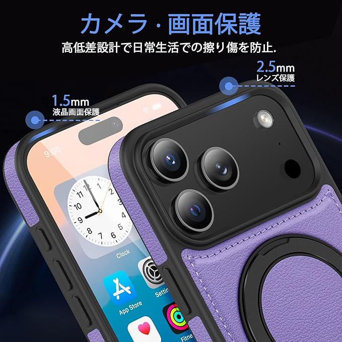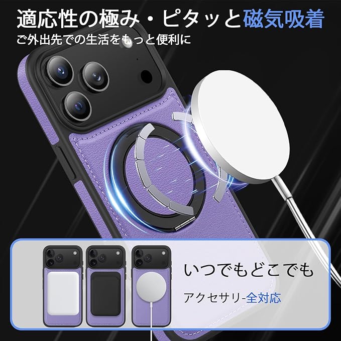 iPhone 17 Pro Max 用ケース Magnetic対応 リング付き 耐衝撃 レンズ保護 アイフォン17 pro max 用ケース マグネット搭載 360 回転 PC+PUレザー 衝撃吸収 スタンド機能 黄変防止 シンプル スマホカバー 紫 J15-47
