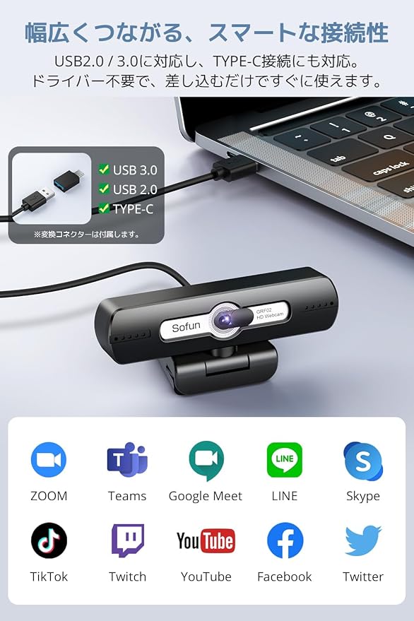【幅広いデバイスに対応・ドライバ不要】USB2.0/3.0およびType-C接続に対応し、Windows(11/10/8/7)、Mac OS、Linux、Chromebookなど幅広いOSで使用可能な 小型 webカメラ 。ドライバ不要・プラグ&プレイ設計により、差し込むだけですぐに使える手軽さも魅力。 Zoom配信カメラ や 配信用 Webカメラ として、YouTube、Facebook、Teams、Twitchなど多様なプラットフォームでの利用もスムーズな 人気 ウェブカメラです。
