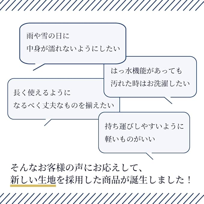 毎日清潔、軽くてやわらか、内側に保温・保冷シートを内蔵。洗濯などによる摩擦に強く耐久性に優れているので、毎日清潔な状態を保つことができます。表面・裏地のはっ水生地の間に、保温・保冷シートを挟んで丁寧に縫製した3層構造です。