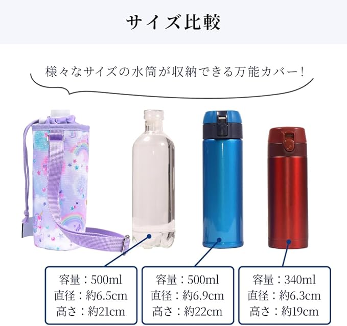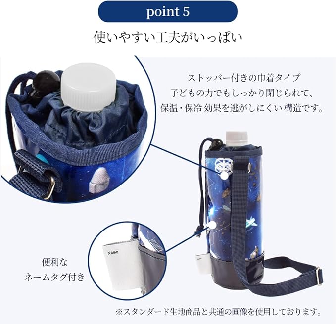 ペットボトルホルダー・水筒ホルダーとしても使える機能性。ペットボトルはもちろん、水筒・ステンレスボトル(500ml・350ml)も収納できます。<br>※直径約7cm・高さ約19cm以下の水筒が収納可能。<br>※高さ19cm以上の水筒は巾着部分からはみ出します。※直径約7cm・高さ約19cm以下の水筒が収納可能。<br>※高さ19cm以上の水筒は巾着部分からはみ出します。