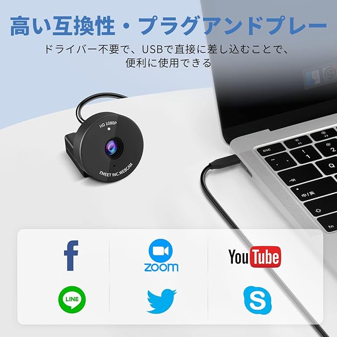 【ドライバー不要高い&高い交換性】EMEET usbカメラ 小型はドライバー不要で、接続したらすぐ使えます。Windows(Win7,8,8.1,,10,11)、macOS(10.14及以上)、Android(V7.0以上)、LunixなどのさまざまなOSが対応され、SkypeやLINE、zoomなど様々なソフトが利用できるので、いろいろなシーンで活躍でき、テレワークを支えるパートナーです。ご注意:本製品はUSB A端子であるため、MacBookとの接続がUSB A-TYPE C変更アタプタが必要です。