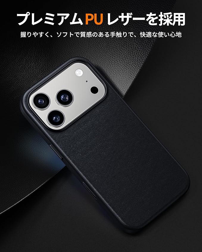 【プレミアムPUレザー】耐久性の高いプレミアムPUレザーを採用。指紋や油分の付着を効果的に防ぎます。レザーの質感はソフトでしなやかなので、握りやすく、使い心地も抜群です。内側は起毛素材で手触りが良く、背面への傷も防げます。