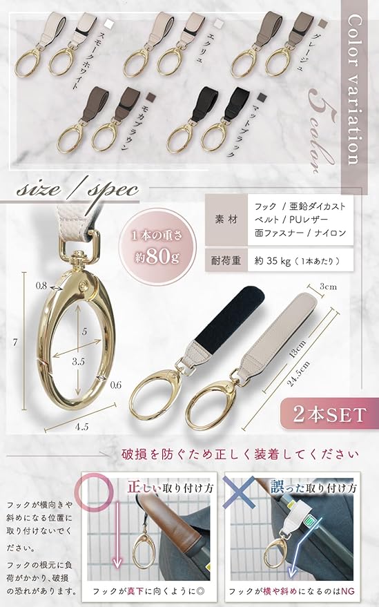 ✅【あなたのお好みでこんな使い方もできます!】キャリーケース、ペットカート、クローゼット、後部座席の荷物掛け、自転車や車椅子にも使用でき、ベビーカー卒業後も活躍!✅【カラー】くすみカラー5色展開(Mat Black(マットブラック)、Moca Brown(モカブラウン)、Graige(グレージュ)、Ecru(エクリュ)、Smoke White(スモークホワイト)【重さ】約80g(1本の重さ) 【素材】フック:亜鉛ダイカスト、ベルト:PUレザー、面ファスナー:ナイロン 【耐荷重】約35kg(1本あたり) 【フックサイズ】外側:高さ7㎝、幅4.5㎝、厚さ0.8㎝、内側:高さ5㎝、幅3.5㎝、厚さ0.6㎝ 【ベルトサイズ】長さ13㎝、幅3cm【全体サイズ】24.5㎝