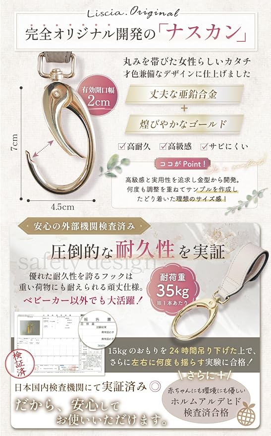 ✅【完全オリジナル開発のナスカン】丸みを帯びた女性らしいカタチ。才色兼備なデザインに仕上げました。「丈夫な亜鉛合金」+「煌びやかなゴールド」。高級感と実用性を追求し金型から開発。何度も調整を重ねてサンプルを作成したどり着いた理想のサイズ感!✅【圧倒的な耐久性を実証】日本国内検査機関にて実証済み◎優れた耐久性を誇るフックは重い荷物にも耐えられる頑丈仕様。ベビーカー以外でも大活躍!更に赤ちゃんにも環境にも優しい「ホルムアルデヒド検査合格」
