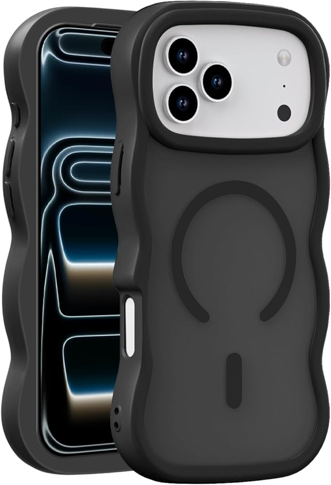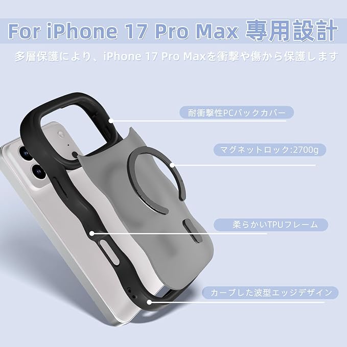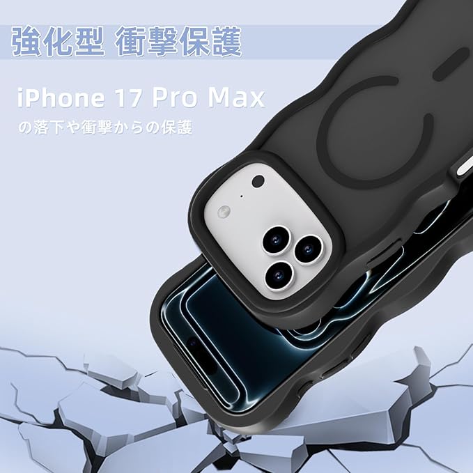 iPhone 17 Pro Max ケース MagSafe対応 耐衝撃 半透明 アイフォン17プロマックス ケース マグネット搭載 iPhone17 pro maxカバー 軽量 波形 薄型 マット感 指紋防止 滑り止め 軽薄型 PC背面TPUバンパー 黄変防止 米軍MIL規格 ストラップホール付き ワイアレス充電対応 アップル17 プロマックス用 (ブラック)