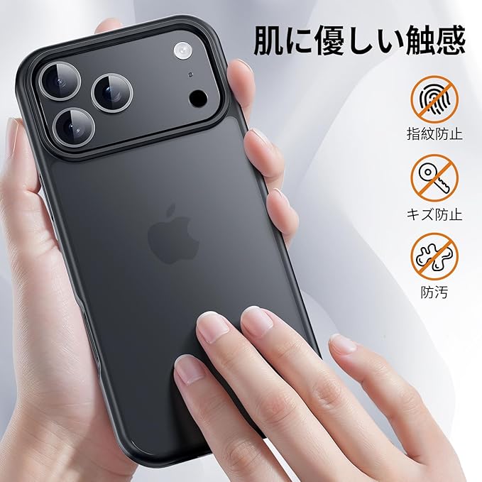 iPhone 17 Pro Max 用 ケース 滑り止め 指紋防止 米軍MIL規格 耐衝撃 マット仕上げ ストラップホール付き アイフォン17ProMax 半透明 黄変防止 耐久性 カバー ワイヤレス充電対応 あいふおん17ProMaxケース 6.9 インチ マットブラック