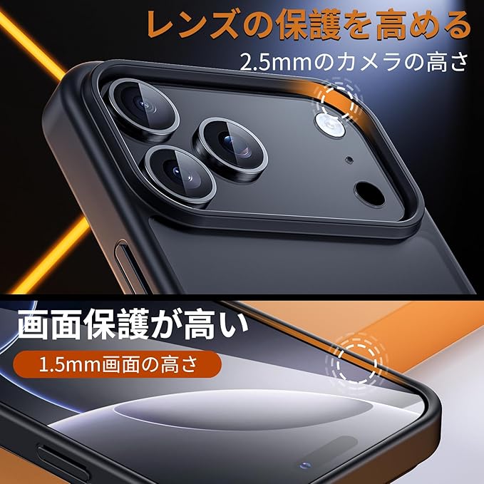 【レンズ保護・損失を軽減】 カメラより2.5mm厚、画面より1.5mm厚で、日常生活において様々な損傷に避ける。スクリーンやレンズの破損リスクを低減、高額の修理費用を節約。このケースとのフィット感を高めるために、購入する前に対応機種をご確認ください。ケース自体に厚みがあり、MagSafeアクセサリーによって充電や吸着することが可能ですが、磁力が弱くなる、ご了承ください。