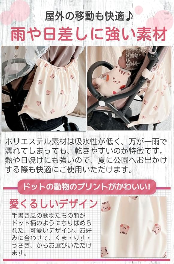 【雨や日差しに強い素材】ポリエステル素材は吸水性が低く、万が一雨で濡れてしまっても、乾きやすいのが特徴です。熱や日焼けにも強いので、夏に公園へお出かけする際も快適にご使用いただけます。