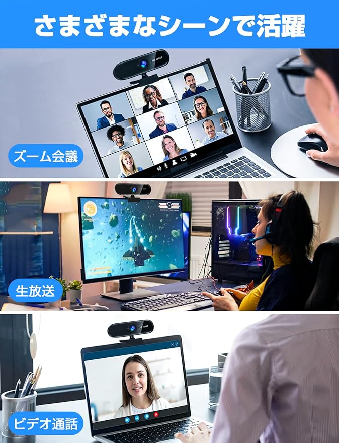 ✨【カメラの向きが自由自在】スケッチなどデスクや手元にある資料を映せるよう、USBカメラ本体は上下左右に角度を調整可能。左右 360 回転&上下60 回転できますので、お好きの角度で通話を楽しめます!ハイスペックな超広角95 ワイドレンズを搭載することで、他社のような枠変形を抑えて自然の映像を再現します。3~4名の小型ミーティングの場合でも全員を画面に映せますので、会議など複数人の場面でも安心です。 【安定した3Wayスタンド】 小型、機敏、かつ調節可能なウェブカメラはノートパソコンやデスクトップパソコンのディスプレイに取り付け可能で、平面にも設置可能なマルチスタンドを採用しています。またマルチスタンド底面には1/4インチ三脚穴を搭載し、市販の三脚に設置して使用できます。