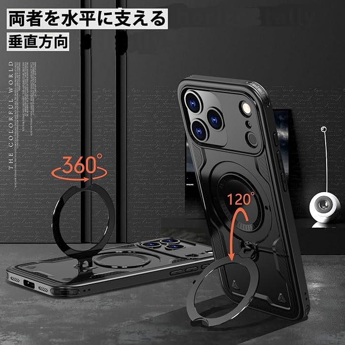 iPhone 17 Pro Max 用ケース MagSafe対応 磁気吸着 ワイアレス充電対応 360 回転リング スマホケース 縦横両対応 スタンド機能 米軍MIL規格取得 耐衝撃 Case Cover アイフォン いphone17promax 17プロマックス 対応 背面 カバー レディース メンズ(ブラック)