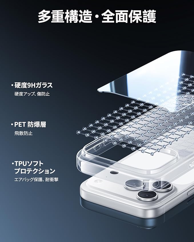 【2025最新改良・黄変防止強化】本製品の背面素材はガラスで、その特性により黄ばみが起こりません。さらに、AF防指紋コーティングを施しているため、指紋や汚れがつきにくく、サッと拭くだけで簡単にきれいになります。ケースを使いやすく、清潔に保つことができます。また側面には、ドイツ製バイエルTPU素材を採用し、TPUポリマーにUV剤を添加して黄変防止性能を高めています。長時間使用しても、光沢と透明感を維持します。