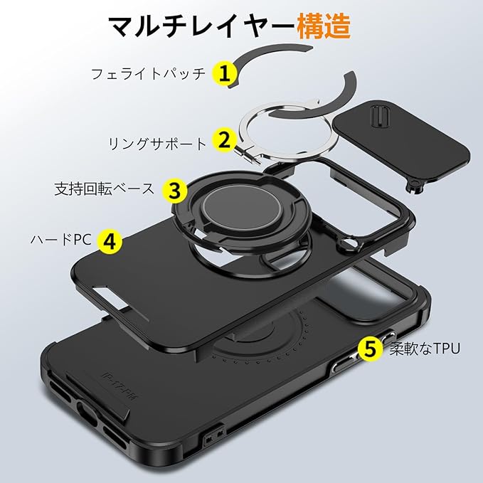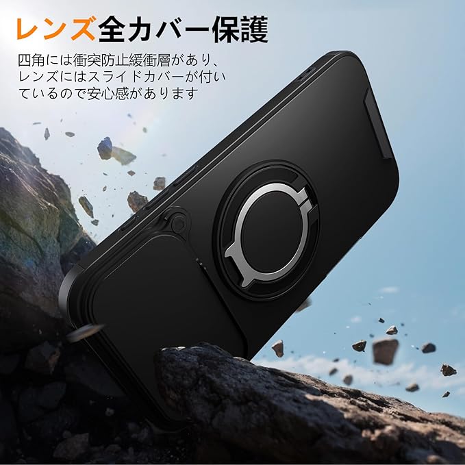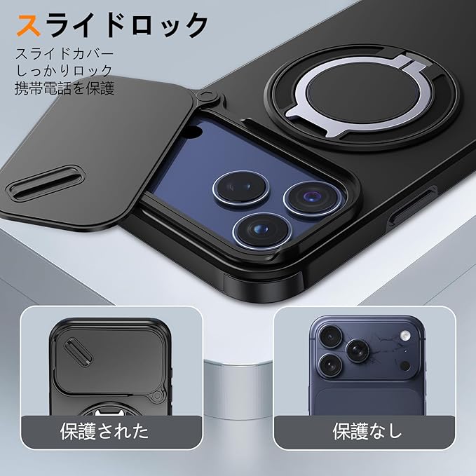 対応 iPhone 17 Pro Max 用 ケース リング付き スライド式カメラカバー 隠しスタンド 耐衝撃 スタンド機能 縦横両対応 車載ホルダー PC TPUバンパー 防塵 人気 落下防止 滑り止め 指紋防止 アイフォン 17 プロ マックス カバー 黒 MJJ-1065-16-01