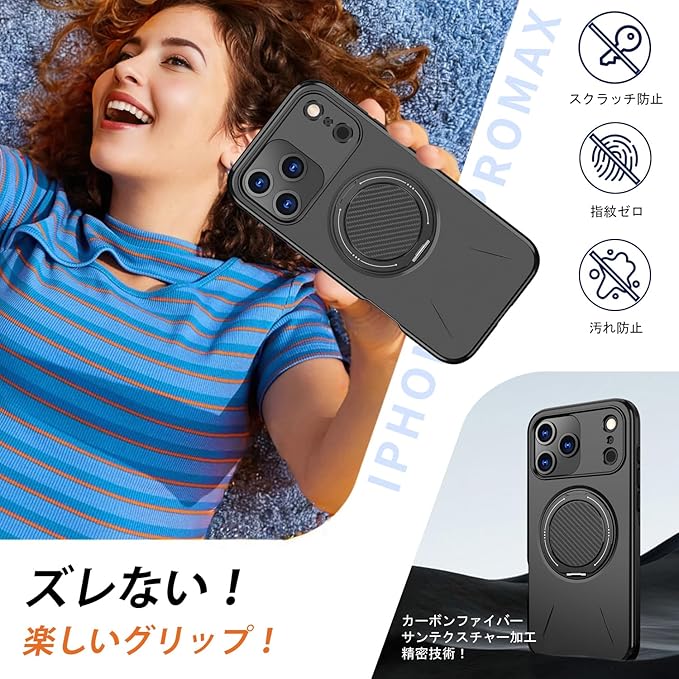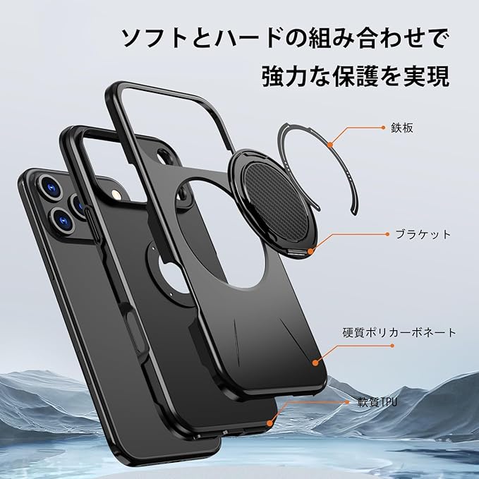 iPhone 17 Pro Max 用 ケース 360 回転スタンド リング付き カバー スタンド機能 縦横両対応 TPU+PU 保護ケース カバー背面 シェル クバー ソフト 耐衝撃性 ストラップホール付き アイフォン 17 Pro Max スマホケース