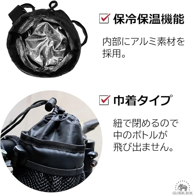 ハンドルバーにつける自転車用ドリンクホルダー です。ペットボトルに対応しています。口は巾着型で、小型のハンドルバーバッグにもなります。