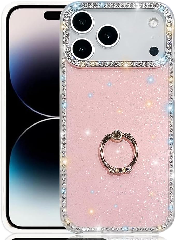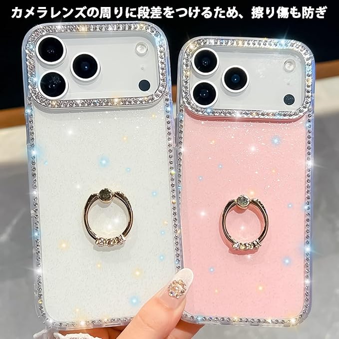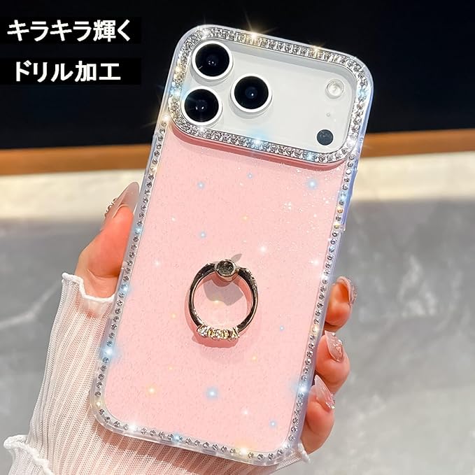 iPhone 17 Pro Max 用 ケース リング付き ドリル きらきら ブリンブリン かわいい スタンド機能 おしゃれ キャラクター 軽量 薄型 衝撃吸収 女性人気 ストラップ穴あり スマホケース アイフォン17プロマックス カバー (実色ピンク)