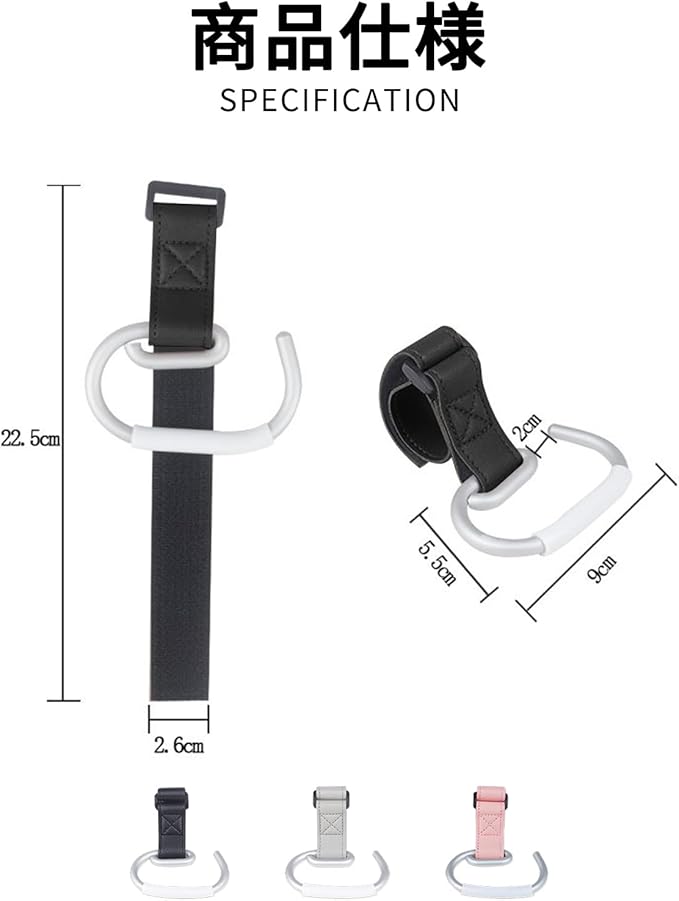 【セット内容】フック2個セットです。サイズ:ベビーカーフック、重量40g。サイズは長さ:13cm、幅:9cm。カラー:ブラック/グレー/ピンク。