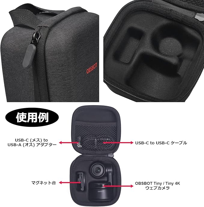 【OBSBOT Tiny / Tiny 4K専用】OBSBOT Tiny / Tiny 4Kウェブカメラ本体、マグネット台、ケーブル、アダプターなどの収納に便利です。手提げ型のデザインで持ち運びやすい。開閉しやすいファスナーを採用し、整然として収納していて、一目瞭然で大変便利です。