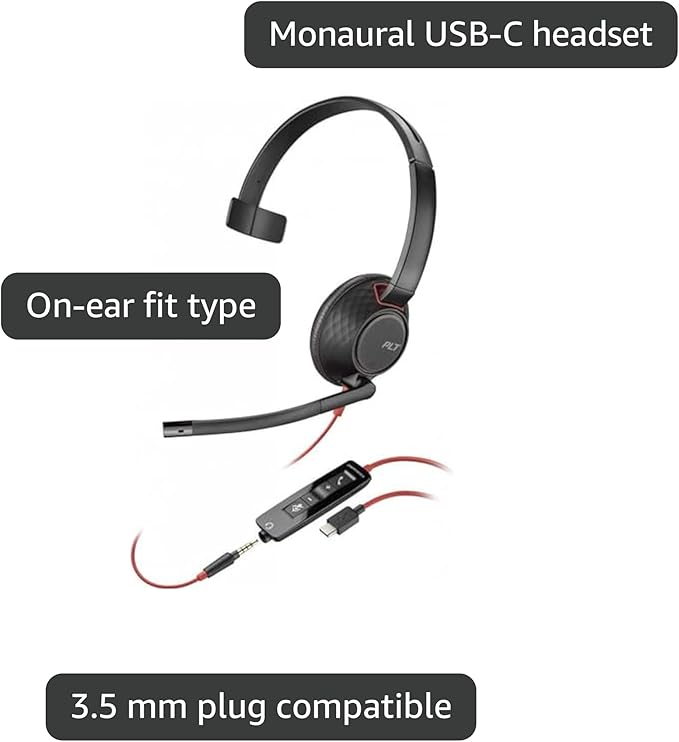 Poly Blackwire 5210 モノラルUSB-Cヘッドセット + 3.5mmプラグ +USB-C/Aアダプター。