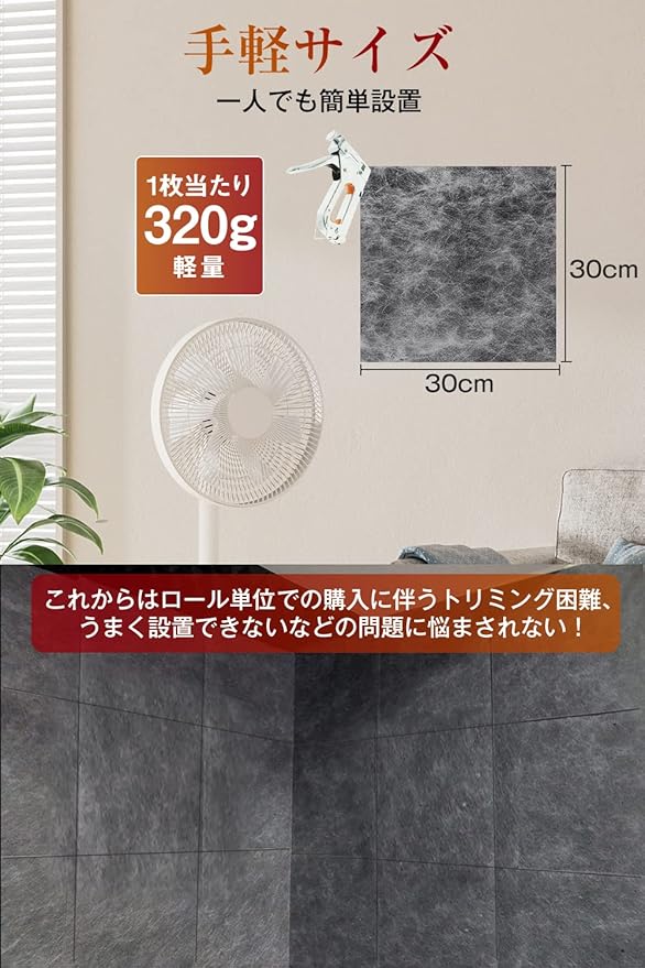 【手軽に設置可能】Moon River遮音材は従来のロール型の取り扱いしずらいという難点を克服し、防音シートサイズを30cmx30cmに改良しました。高精度に加工され、1枚当たりの重さがわずか0.32kg。素人ても手軽に設置できます。