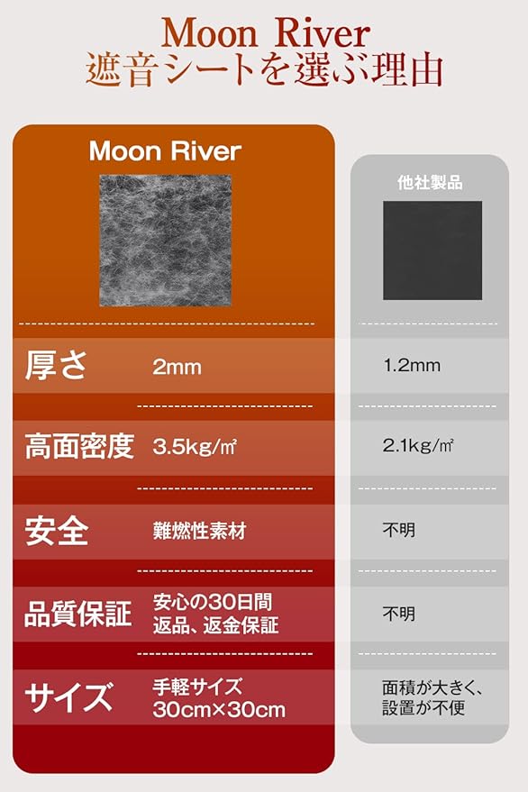 【使用上のアドバイス】遮音材をノイズが伝わってくる側の壁や床に設置し、ノイズを音源から遮断することがお勧めです。設置範囲は部屋の壁の70%以上であることをお勧めします。相性の良いMoon River吸音材と合わせて使用すると相乗効果で大幅に吸音効果と防音性能を発揮できます。