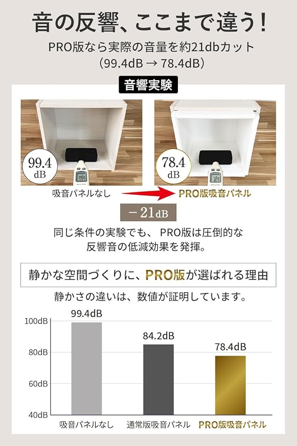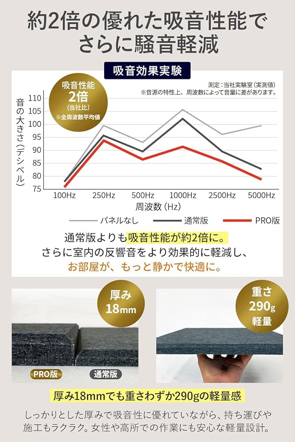 ✅【 PRO仕様の音響・騒音対策。防音ブースや楽器練習室などにも 】壁や天井に貼り付けるだけで音響対策になる吸音パネルPROは、従来の9mm厚タイプと比較して、厚みを18mmに増すことで、より高い吸音性能を発揮。室内に響く不快な反響音をさらに効果的に抑え、音声や音楽をよりクリアに聴くことができます。