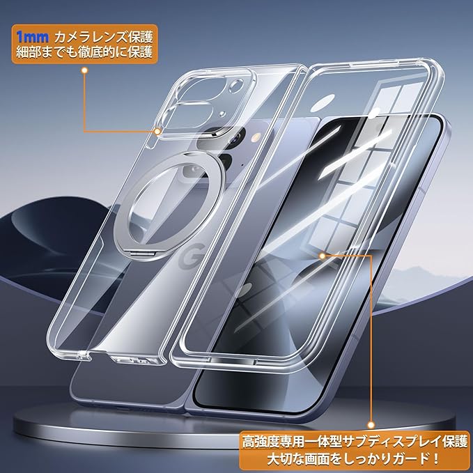 Google Pixel 10 Pro Fold 用 ケース クリア MagSafe対応 360 回転スタンド フィルム一体型 Fadkzyxr スマホケース グーグル ピクセル 10プロ フォールド カバー リング付き レンズ保護 黄ばみ防止 マグセーフ ワイヤレス充電対応 透明 耐衝撃 ストラップホール付き-クリア