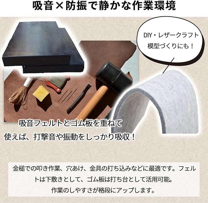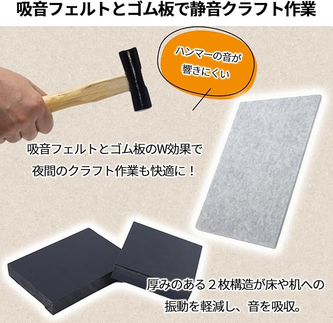 ハンマーの音が響きにくい!吸音フェルトとゴム板のW効果で、夜間のクラフト作業も快適に。厚みのある2枚構造が床や机への振動を軽減し、音を吸収。周囲を気にせず集中して手作業に没頭できます。金属加工やレザークラフトなど幅広く対応。作業音に悩む方におすすめのアイテムです。