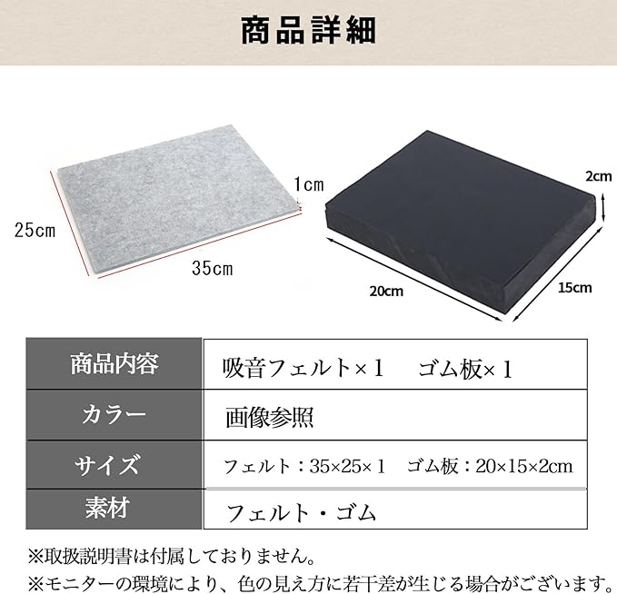 ※取扱説明書は付属しておりません。【商品内容】吸音フェルト 1、ゴム板 1【カラー】画像参照 【サイズ】フェルト:35 25 1cm、ゴム板:20 15 2cm【素材】フエルト、ゴム ※モニターの環境により、色の見え方に若干差が生じる場合がございます。