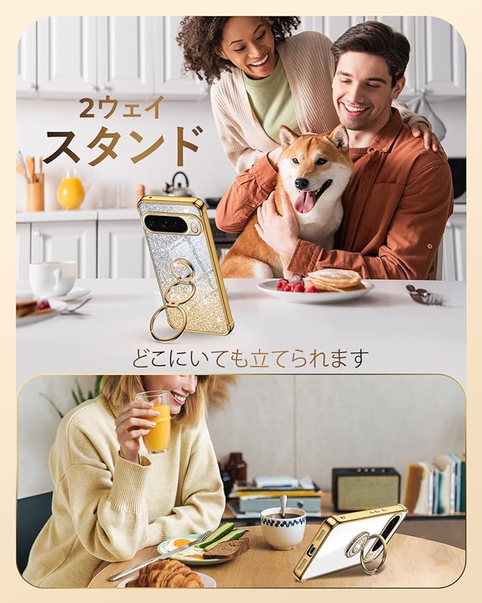 【2ウェイ360 リングスタンド】このPixel 10用ケースは、180 折り畳み、360 回転できるハート型のリングが特徴です。このダブルリングスタンドは、複数の角度を調整でき、縦向きと横向きの両方のモードをサポートします。安定しており、読書、サーフィン、映画鑑賞、FaceTimeをするときに快適です。