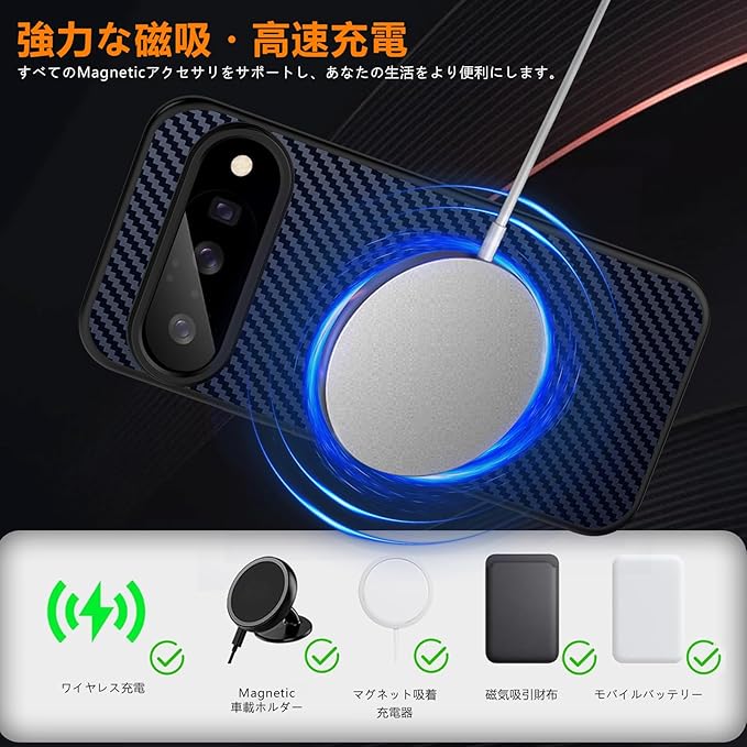 【鉄片磁気吸引コイルの加持】鉄片磁気吸引コイルを内蔵し、各種磁気吸引部品と完璧に適合でき、車載磁気吸引スタンドであれ、磁気吸引無線充電器であれ、簡単に使用でき、外出と充電に極めて便利をもたらす(当店ではケースのみ販売しており、磁気吸引部品はございません)