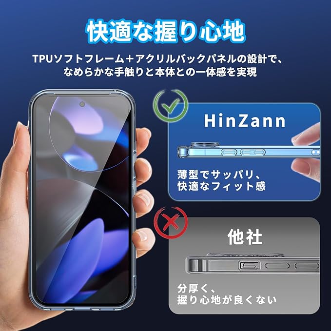 [巧妙なデザイン]柔軟性のあるTPUフレームとアクリルバックプレートを採用し、日常の取り付け・取り外し時にスマホを傷つけず、指紋も付きにくく、快適な手触りを実現。ケースは高さ調整が施され、ディスプレイより0.8mm、カメラより0.5mm高く設計。四隅には強化エアバッグを搭載し、衝撃を効果的に吸収。1.5メートルの落下テストをクリアし、全面的なスクラッチ防止と耐衝撃性を提供。さらに、ストラップホールを装備し、お好みのストラップを取り付け可能。