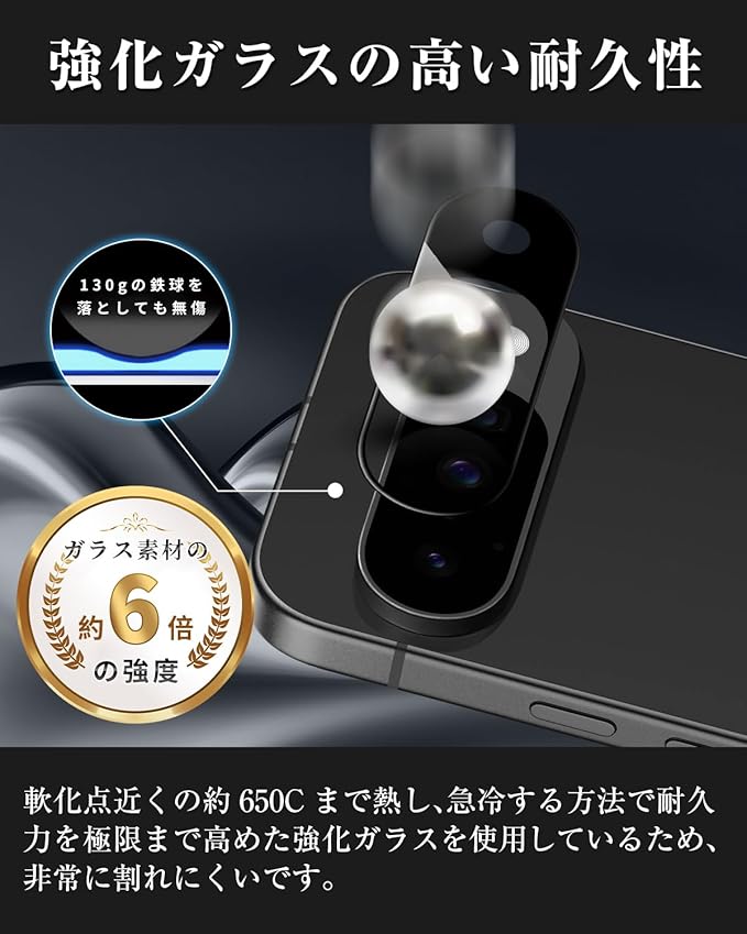 【超高品質素材】対応 Google Pixel 10 カメラフィルムは日本旭硝子製の強化ガラスを採用し、9Hの超高硬度を持っています。ハードコーティング技術により外部からの衝撃をフィルムが吸収し、画面へのダメージを最小限に抑えます。ナイフや鍵などの鋭いものでも簡単に傷がつきません。万が一カメラフィルムが破損した場合でも、ガラス片が飛散しないよう飛散防止処理が施されています。