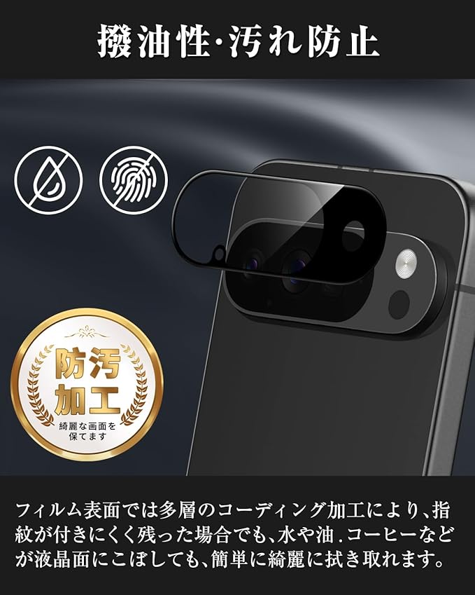 【指紋防止、撥水、油防止】対応 Google Pixel 10 カメラフィルムの表面はハードコート加工、オイルコーティング加工といった様々な特殊加工を組み合わせ油分やほこり、指紋に対しての抵抗力が非常に強くなったので,指紋や汚れの跡がカメラに付きにくく、スマホをずっときれいなボディーを保持させ、頻繁にレンズを拭く悩みがなくなります。