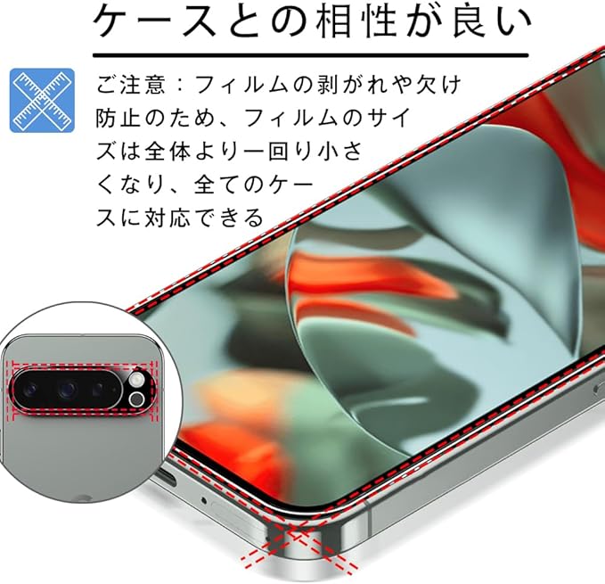 【貼付け簡単ガラス】 Google Pixel 9 pro XLフィルム接着面に吸着に優れたシリコンコーティングを施しているので、シリコン自己吸着層をもっており位置を合わせて置くだけで気泡なしで貼れ、フィルム貼りが苦手という方でも簡単に貼る事が可能です。薄くて軽いデザインで、まるで携帯自体だけを持っているような感じです。それに2.5Dラウンドエッジ加工を施され、全体の画面より一回り小さい仕様なのため、 Google Pixel 9 pro XLケースに邪魔しません。