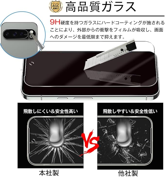 【高品質ガラス】日本旭硝子製ガラス素材を使用しており、9Hの表面硬度を誇る保護フィルムです。通常のPETフィルムより4倍の強度、鍵やカッターなどの鋭利な物を当てても損傷なく使用する事が可能で、摩擦や傷から液晶ガラスをしっかり保護します。万が一強力な衝撃でガラスフィルムが割れてしまっても、破片の飛び散りを防ぐ飛散防止コート処理で、画面をしっかり保護、スマホ本体と共に手の怪我の心配もありません。二重の保護で日常生活では、スマホを落としたり衝撃を受けたりした時に、保護フィルムがあれば、画面やレンズの破損を気にすることなく、しっかりと保護することができます。