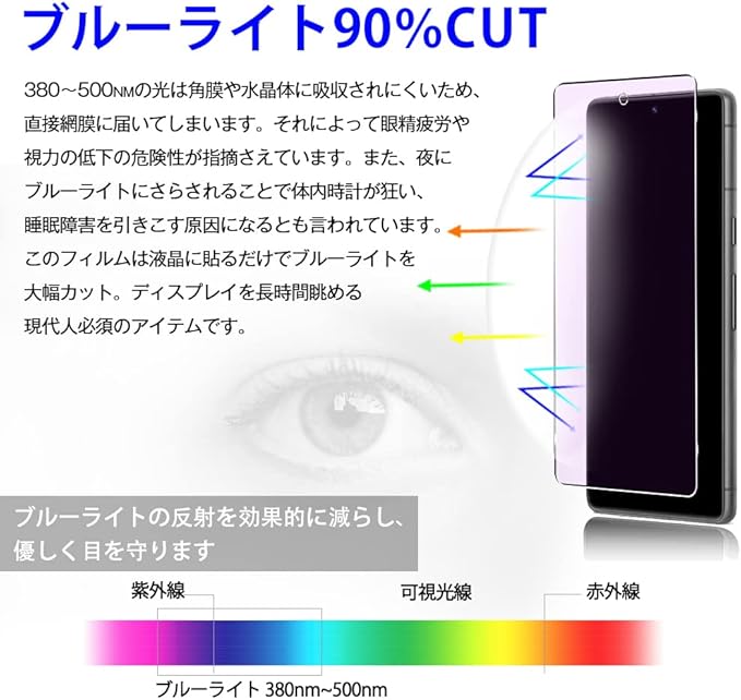 【ブルーライトカット】目の水晶体で吸収されにくく網膜を傷つける恐れがあるブルーライトを集中カット。ゲームや動画視聴で画面を長時間見続ける人や、お子様用のフィルムを探している方々にオススメ!