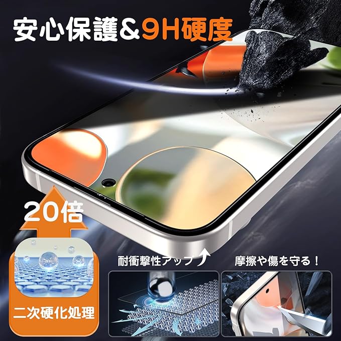 【二次硬化处理&9h硬度】Pixel 9 フィルムは日本製AGCのガラス材料を採用し、一般的な熱強化処理を行った後に、二次硬化処理を行っています。1000回以上のひっかき傷テストと落下テストに無傷と、落下に対する耐性が高い。每年にわたって、日本で累計10万枚販売し、画面の破損記録がゼロとなっています。