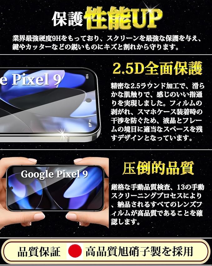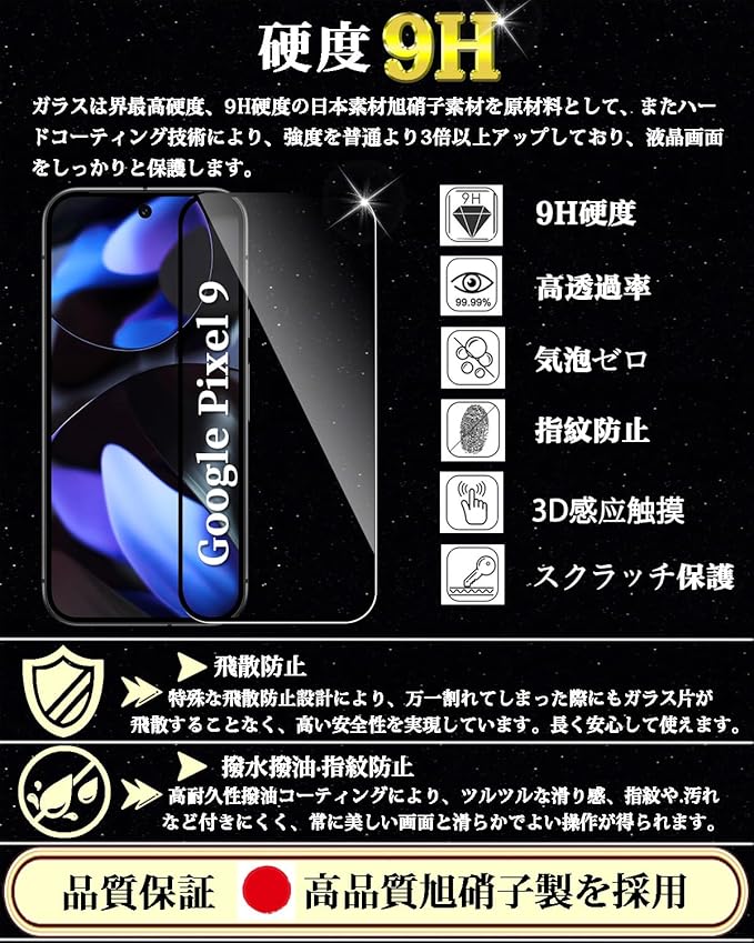対応 Google Pixel 9 全面保護 ガラスフィルム グーグル ピクセル9 液晶保護フィルム【2枚入り】Pixel9 強化ガラス日本製旭硝子製 硬度9H 飛散防止 高透過率 気泡防止 撥水撥油 衝撃吸収 自動吸着 6.3インチ