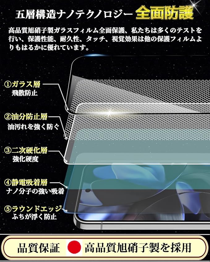 特徴 全面保護,9H表面硬度,飛散防止,防指紋,撥油コーティング,撥水剤,耐衝撃性,ラウンドエッジ,気泡なし,高透過率,簡単貼り付け